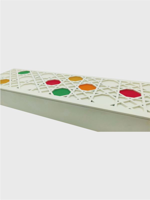 This innovative packaging solution is a pristine white MDF box with a multicolored hexagon jaali design on its lid. Its sleek cuboidal shape makes it ideal for gifts or innovating invitations. The inside can also be filled with wooden shavings or cavity trays, and customization options are available to match your style and occasion.