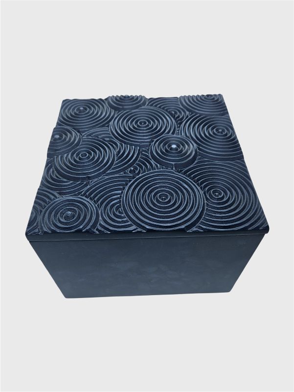 Craftedfor elegance and impact, this MDF packaging box is built to impress. It boasts generous dimensions of 8”x8”x5.5”, making it suitable for housing large and luxurious items. The box features a flushed lid and base, both painted in deep black for a sleek, modern finish. The real highlight is the 3D CNC-carved lid with a ripple-like geometric pattern, resembling overlapping waves—an artful detail that enhances its visual appeal. The lid also has a seamless, borderless design, giving it an infinity lid appearance. Free from lifting knobs, the design flows uninterrupted, making it a visually striking handcrafted packaging solution.